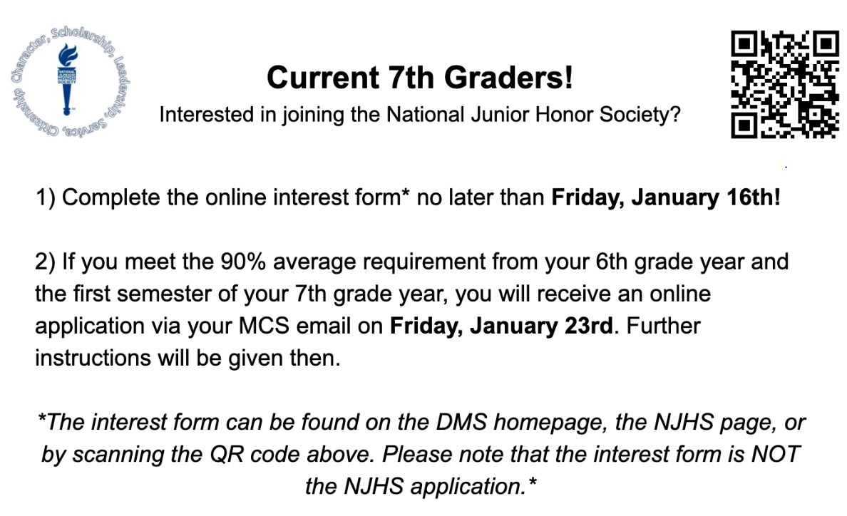 The interest form can be found on the DMS homepage, the NJHS page, or by scanning the QR code on posters throughout the school. Please note that the interest form is NOT the NJHS application.